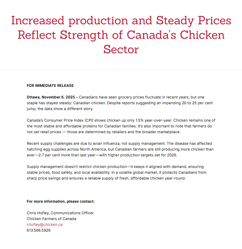 NEWS November 13, 2025 CFC – Supply Management Bulletin Chicken Farmers of Canada – Supply Management Bulletin View All News