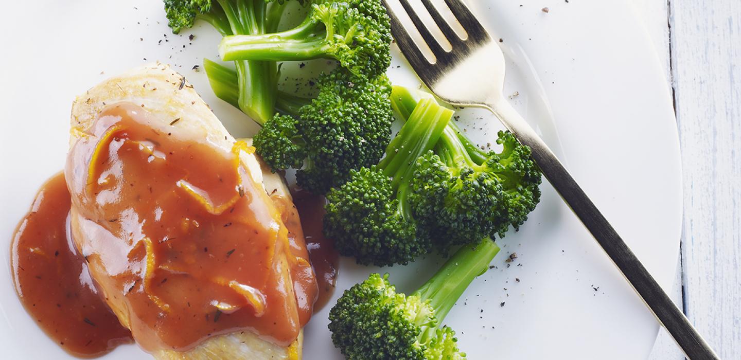 - 3 Reduce heat to medium or medium low and add chicken broth, orange juice, orange zest, and thyme. Cover and cook until chicken is thoroughly cooked and the chicken reaches an internal temperature of 165°F (74°C).