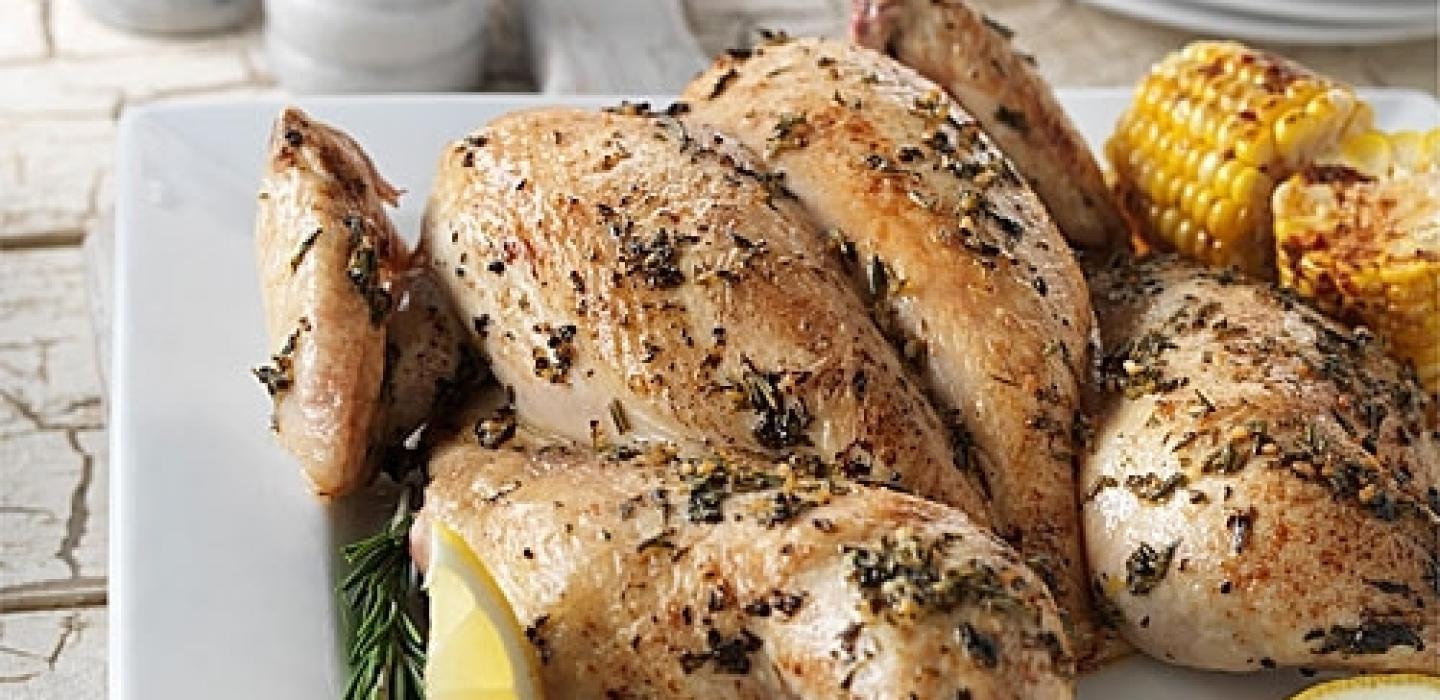 - 3 Season the chicken with salt and pepper on both front and back. Gently loosen the skin on the breasts by running your fingers underneath. Spread about one quarter of the herb mixture under the skin. Rub the remaining mixture over the front and back of the chicken. Place chicken on a plate and wrap; refrigerate for 30 minutes or up to two hours.