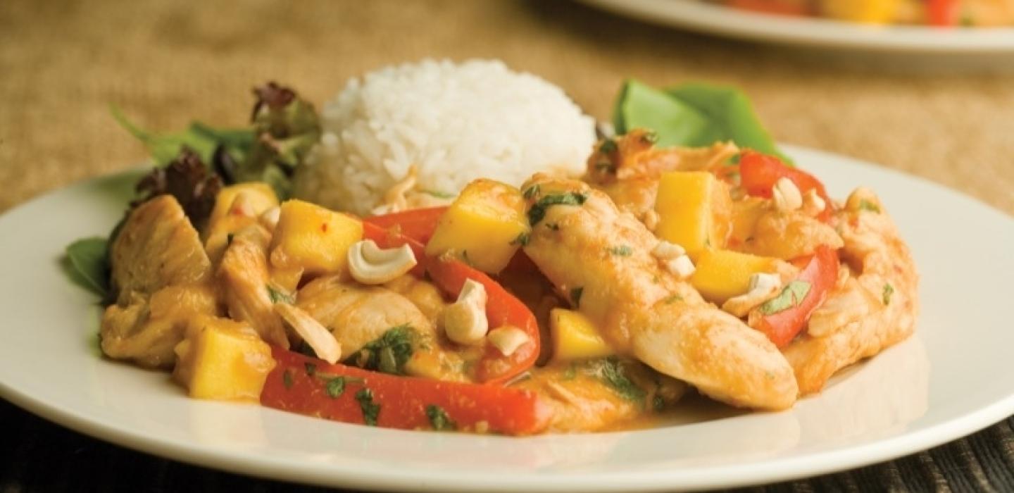 - 6 Arrange mixed greens around the edge of each of four plates. Serve mango chicken with a scoop of cooked jasmine rice. Garnish each plate with some of the roasted whole cashews.