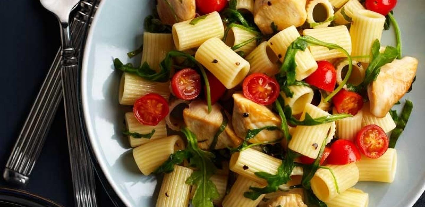 - 4 Add chicken to bowl with the cooked pasta and arugula.