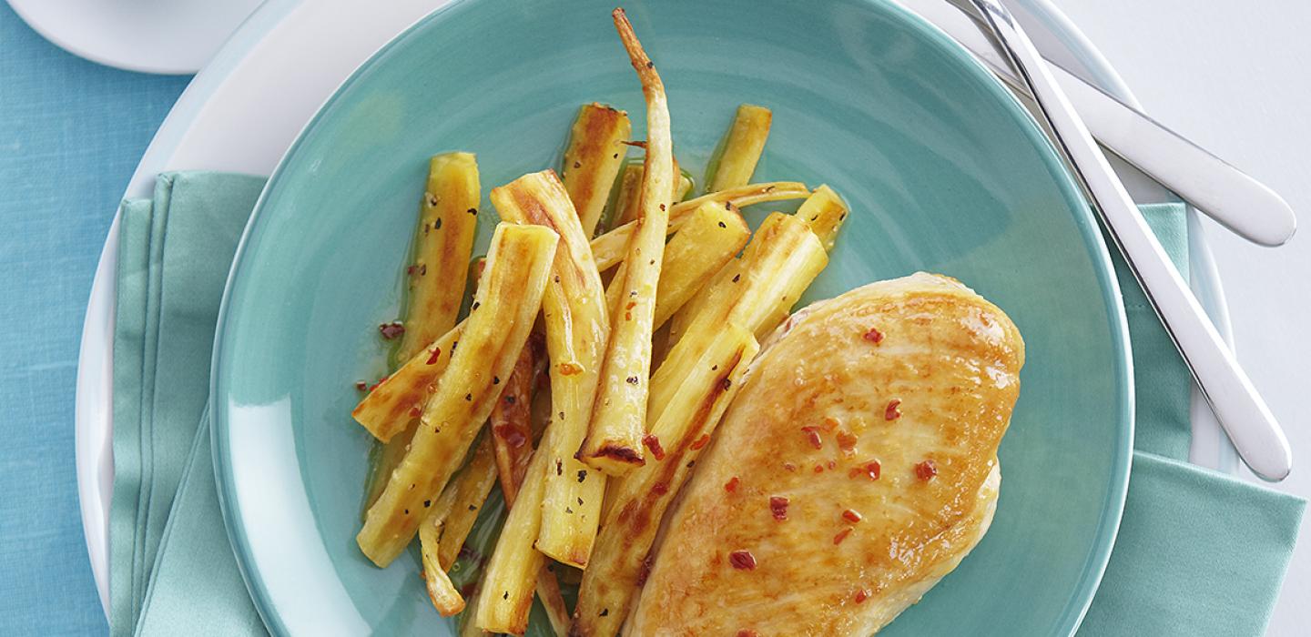 - 2 Prepare parsnip fries. Scrub and quarter the parsnips lengthwise. If they are large, cut lengthwise into eighths. Toss with 1 tablespoon + 2 teaspoons olive oil (25mL) in a large shallow baking pan and sprinkle with 1/4 teaspoon salt (1.25 mL) and pepper. A cast iron frying pan also works well. Roast in oven at high heat, for 10 minutes, while preparing chicken. Toss.